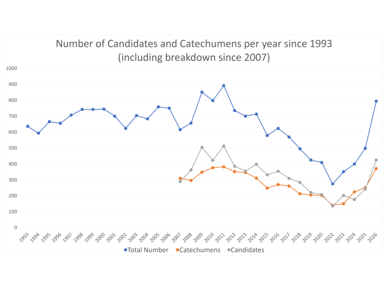 Xét về số lượng, khóa năm 2026 là khóa lớn thứ tư kể từ khi giáo phận bắt đầu lưu trữ hồ sơ vào năm 1993. Số người gia nhập Giáo hội Công giáo cao nhất là vào năm 2011, với 891 người, bao gồm 63 ứng viên gia nhập qua Bản Quy chế Cá nhân dành cho những người Anh giáo trước đây.Từ năm 1993 đến khoảng năm 2014, mức tham gia tương đối ổn định, sau đó giảm dần và chạm mức thấp nhất vào năm 2022 trong thời kỳ đại dịch. Từ đó đến nay, con số đã tăng mạnh, đạt mức chưa từng thấy trong mười lăm năm. Khóa năm nay tăng 60% so với năm 2025.